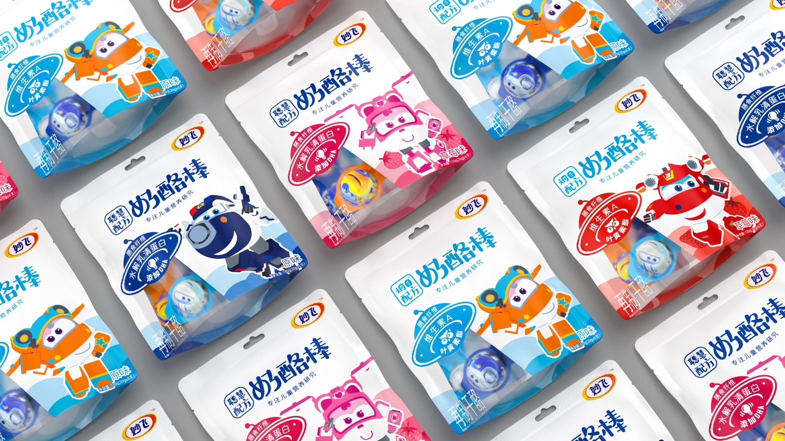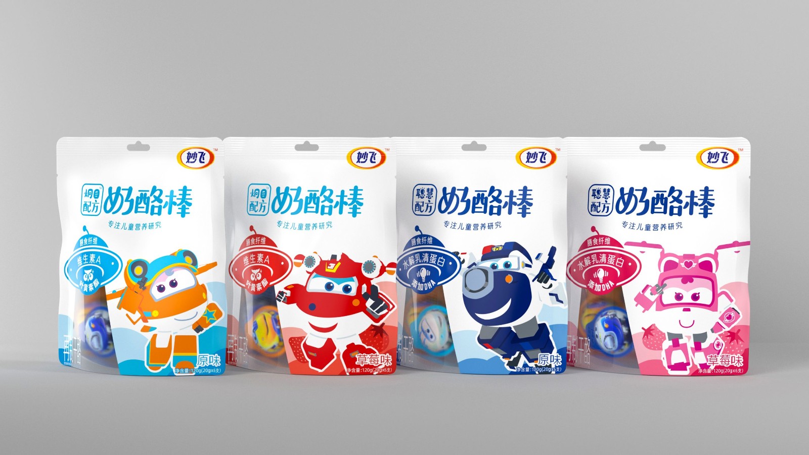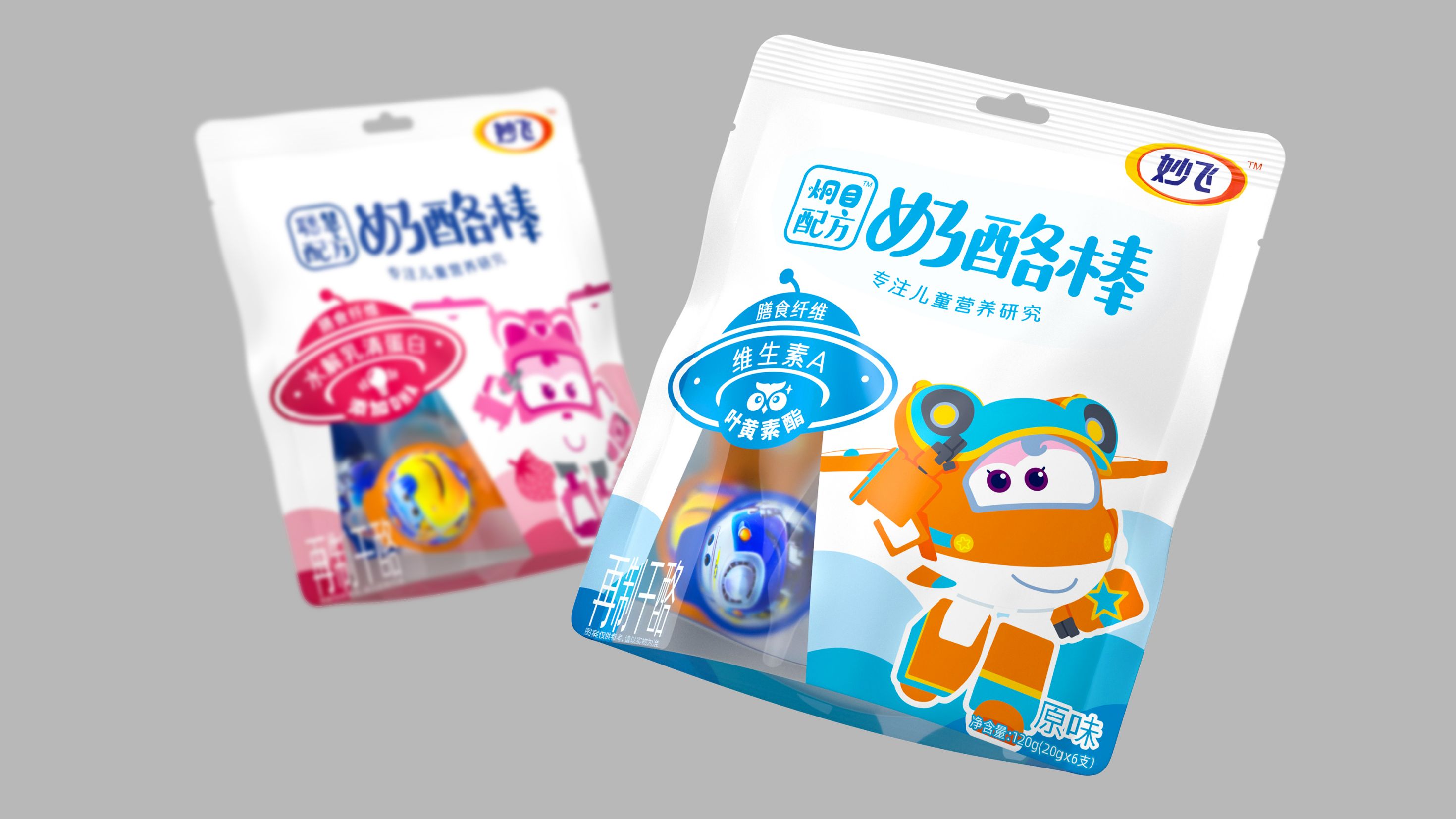 奶酪棒主要以儿童补钙零食为主要消费场景,消费频次高,粘性大,且被认为是替代了儿童对于糖果的需求。妙飞2021年全新推出配方奶酪棒,产品切入功能细分领域,推出益智、护眼配方奶酪棒,科学配比功能营养元素,在做到产品更安全、更有营养的同时,品牌也需要通过包装传达出其特性。