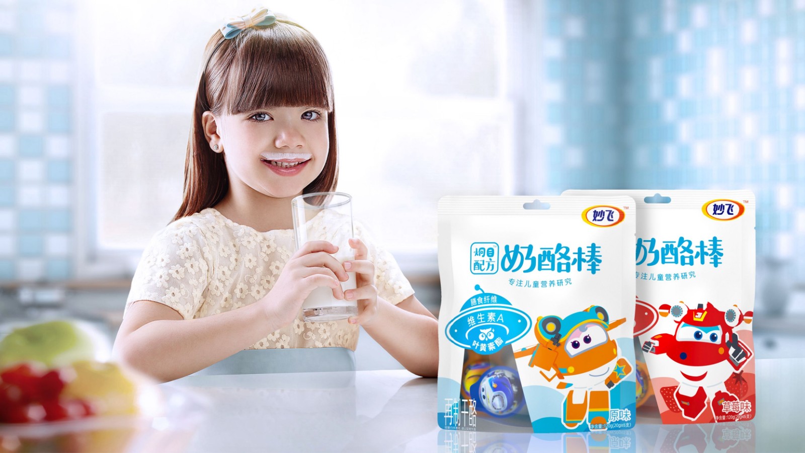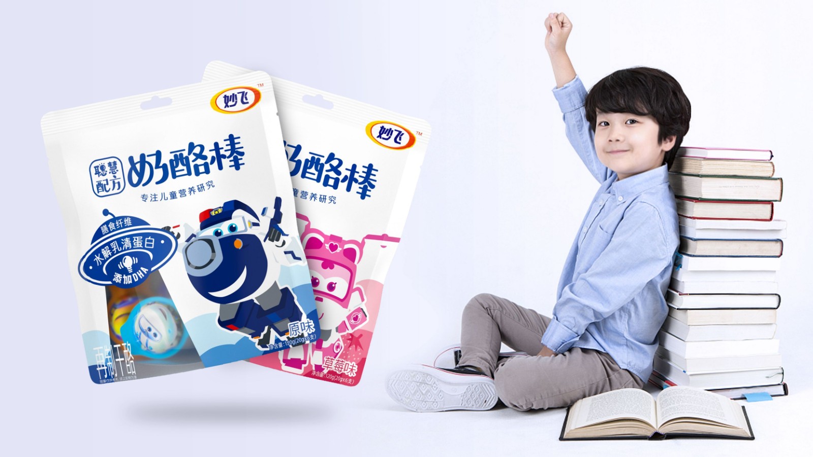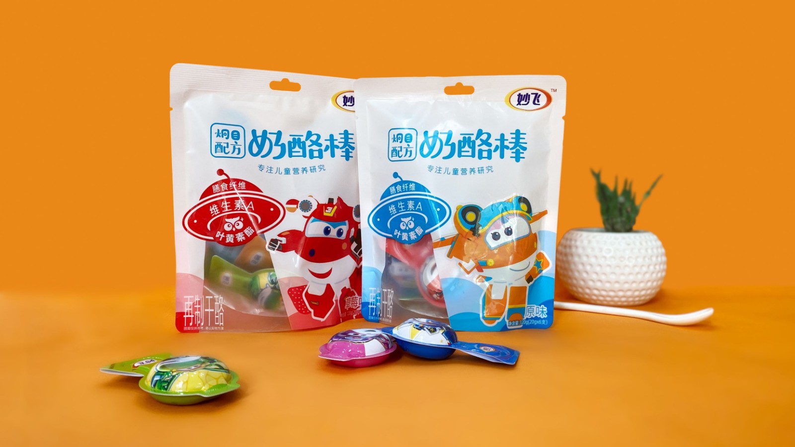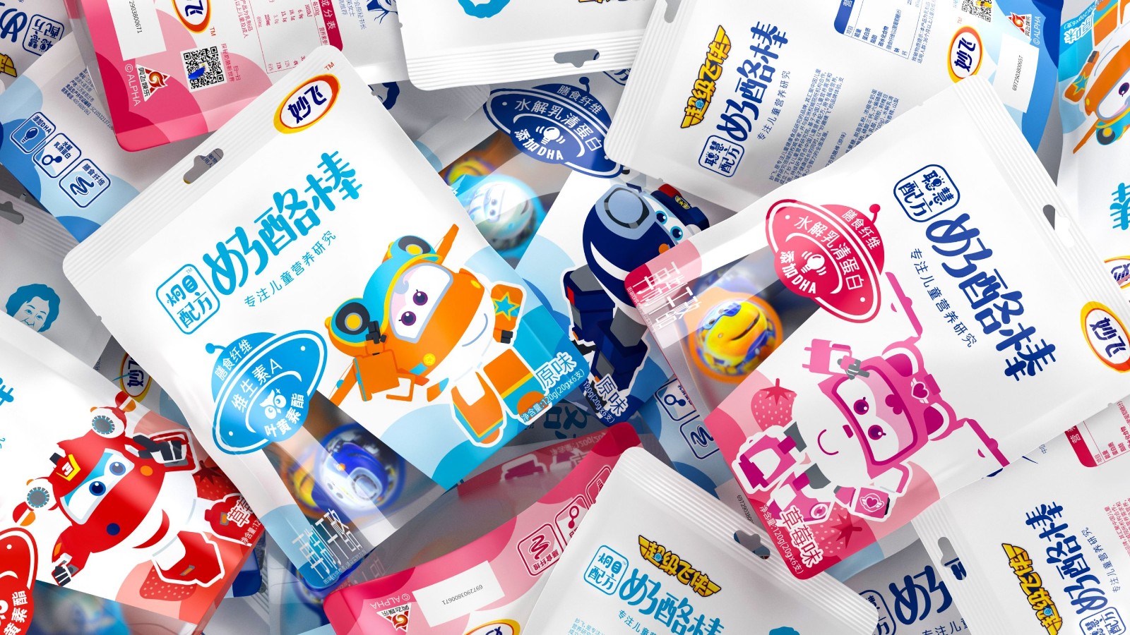 奶酪棒主要以儿童补钙零食为主要消费场景,消费频次高,粘性大,且被认为是替代了儿童对于糖果的需求。妙飞2021年全新推出配方奶酪棒,产品切入功能细分领域,推出益智、护眼配方奶酪棒,科学配比功能营养元素,在做到产品更安全、更有营养的同时,品牌也需要通过包装传达出其特性。